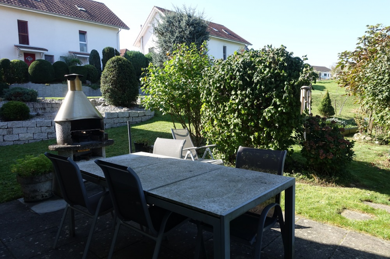 Das Familienquartier ist neueren Jahrgangs. Es besteht aus vielen Mehr- und Einfamilienhäu-sern. Dieses charmante 6-Zimmer Einfamilienhaus entstand 1999 und liegt am Ende einer Sackgasse. Die Liegenschaft von solider Bauqualität liegt sehr ruhig, angrenzend an die Landwirtschaftszone, welche mit 744 m2 zum Objekt gehört und somit nicht verbaut werden kann. Das Haus verfügt über mehrere Sitzplätze mit viel Privatsphäre.